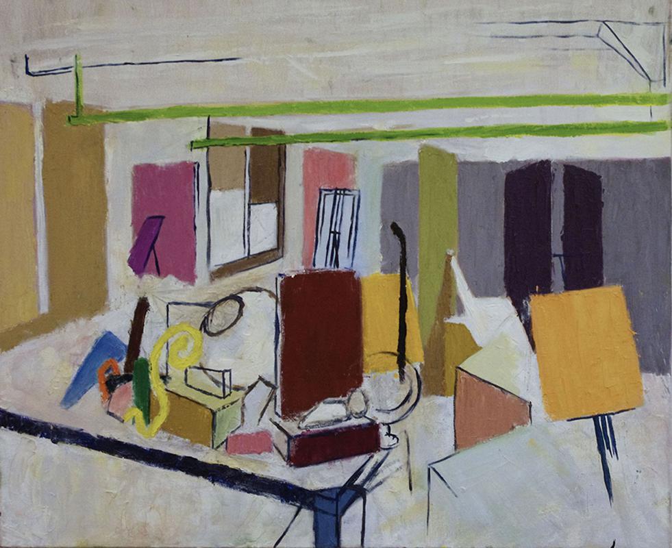 In this body of work, I explored the concept of home and searched for a Heideggerian sense of being-in-the-world through the visual study of my studio, Pendleton West 321. Adopting the idea of the space-place-home continuum as put forth by geographer Yi-Fu Tuan, I thought of painting as a means to thoroughly familiarize myself with the space and turn it into a place. Aiming to minimize movement and to encourage a state of contemplation, I reduced the room into flat shapes but preserved representative impulses; I had a formal interest in color and overlapping surfaces but welcomed moments of recognition and comfort, too. First, I dwelt on small canvas on wood surfaces, which at as small as 6x6″ became miniature objects. According to philosopher Gaston Bachelard’s The Poetics of Space, miniatures are gates which open up new worlds. I entered these worlds by taking Bachelard’s metaphorical magnifying glass: I enlarged small segments of my paintings onto large canvases stretched directly on studio walls. Painting from painting, with composition and color already determined, I reduced my process to re-mixing color and applying paint. In this familiar process and in the environment of large canvases, I was at home.