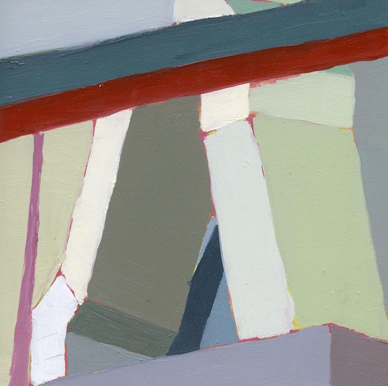 In this body of work, I explored the concept of home and searched for a Heideggerian sense of being-in-the-world through the visual study of my studio, Pendleton West 321. Adopting the idea of the space-place-home continuum as put forth by geographer Yi-Fu Tuan, I thought of painting as a means to thoroughly familiarize myself with the space and turn it into a place. Aiming to minimize movement and to encourage a state of contemplation, I reduced the room into flat shapes but preserved representative impulses; I had a formal interest in color and overlapping surfaces but welcomed moments of recognition and comfort, too. First, I dwelt on small canvas on wood surfaces, which at as small as 6x6″ became miniature objects. According to philosopher Gaston Bachelard’s The Poetics of Space, miniatures are gates which open up new worlds. I entered these worlds by taking Bachelard’s metaphorical magnifying glass: I enlarged small segments of my paintings onto large canvases stretched directly on studio walls. Painting from painting, with composition and color already determined, I reduced my process to re-mixing color and applying paint. In this familiar process and in the environment of large canvases, I was at home.
