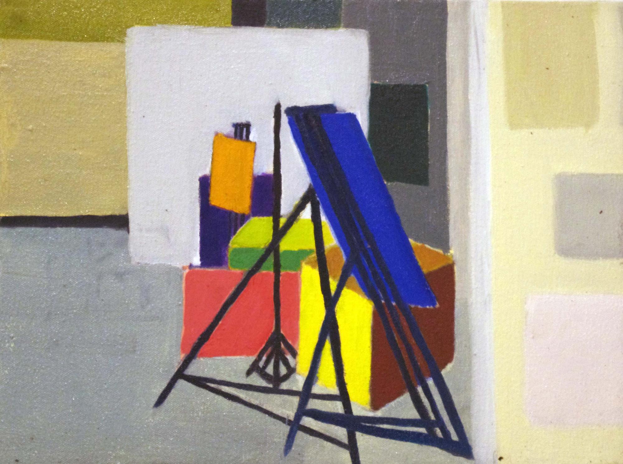 In this body of work, I explored the concept of home and searched for a Heideggerian sense of being-in-the-world through the visual study of my studio, Pendleton West 321. Adopting the idea of the space-place-home continuum as put forth by geographer Yi-Fu Tuan, I thought of painting as a means to thoroughly familiarize myself with the space and turn it into a place. Aiming to minimize movement and to encourage a state of contemplation, I reduced the room into flat shapes but preserved representative impulses; I had a formal interest in color and overlapping surfaces but welcomed moments of recognition and comfort, too. First, I dwelt on small canvas on wood surfaces, which at as small as 6x6″ became miniature objects. According to philosopher Gaston Bachelard’s The Poetics of Space, miniatures are gates which open up new worlds. I entered these worlds by taking Bachelard’s metaphorical magnifying glass: I enlarged small segments of my paintings onto large canvases stretched directly on studio walls. Painting from painting, with composition and color already determined, I reduced my process to re-mixing color and applying paint. In this familiar process and in the environment of large canvases, I was at home.