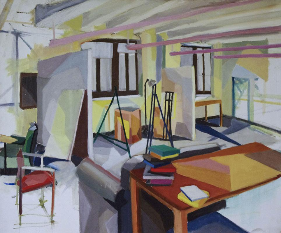 In this body of work, I explored the concept of home and searched for a Heideggerian sense of being-in-the-world through the visual study of my studio, Pendleton West 321. Adopting the idea of the space-place-home continuum as put forth by geographer Yi-Fu Tuan, I thought of painting as a means to thoroughly familiarize myself with the space and turn it into a place. Aiming to minimize movement and to encourage a state of contemplation, I reduced the room into flat shapes but preserved representative impulses; I had a formal interest in color and overlapping surfaces but welcomed moments of recognition and comfort, too. First, I dwelt on small canvas on wood surfaces, which at as small as 6x6″ became miniature objects. According to philosopher Gaston Bachelard’s The Poetics of Space, miniatures are gates which open up new worlds. I entered these worlds by taking Bachelard’s metaphorical magnifying glass: I enlarged small segments of my paintings onto large canvases stretched directly on studio walls. Painting from painting, with composition and color already determined, I reduced my process to re-mixing color and applying paint. In this familiar process and in the environment of large canvases, I was at home.