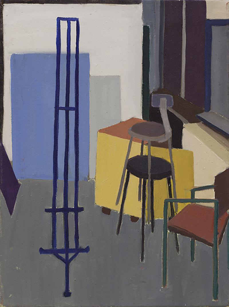 In this body of work, I explored the concept of home and searched for a Heideggerian sense of being-in-the-world through the visual study of my studio, Pendleton West 321. Adopting the idea of the space-place-home continuum as put forth by geographer Yi-Fu Tuan, I thought of painting as a means to thoroughly familiarize myself with the space and turn it into a place. Aiming to minimize movement and to encourage a state of contemplation, I reduced the room into flat shapes but preserved representative impulses; I had a formal interest in color and overlapping surfaces but welcomed moments of recognition and comfort, too. First, I dwelt on small canvas on wood surfaces, which at as small as 6x6″ became miniature objects. According to philosopher Gaston Bachelard’s The Poetics of Space, miniatures are gates which open up new worlds. I entered these worlds by taking Bachelard’s metaphorical magnifying glass: I enlarged small segments of my paintings onto large canvases stretched directly on studio walls. Painting from painting, with composition and color already determined, I reduced my process to re-mixing color and applying paint. In this familiar process and in the environment of large canvases, I was at home.