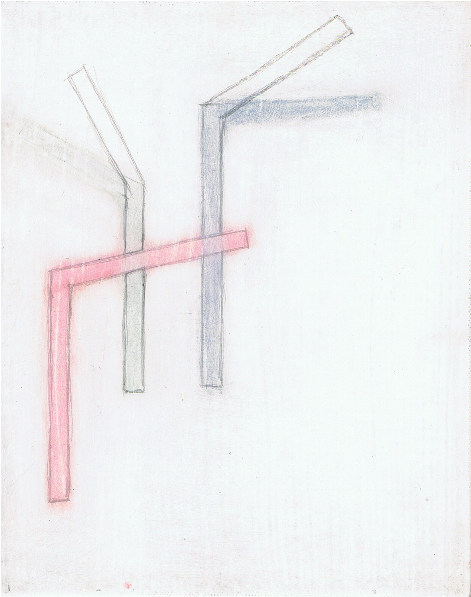 At Sea (in London) is a series of paintings that emerged from researching London’s skyscraper boom, with a close focus on the way construction cranes dominate the skyline. The paintings engage with a simple motif akin to cranes: vertical lines topped with diagonals move across stained and sanded grounds. In these images, the goal was to address the ephemeral and mobile, yet defining and monumental nature of cranes.
