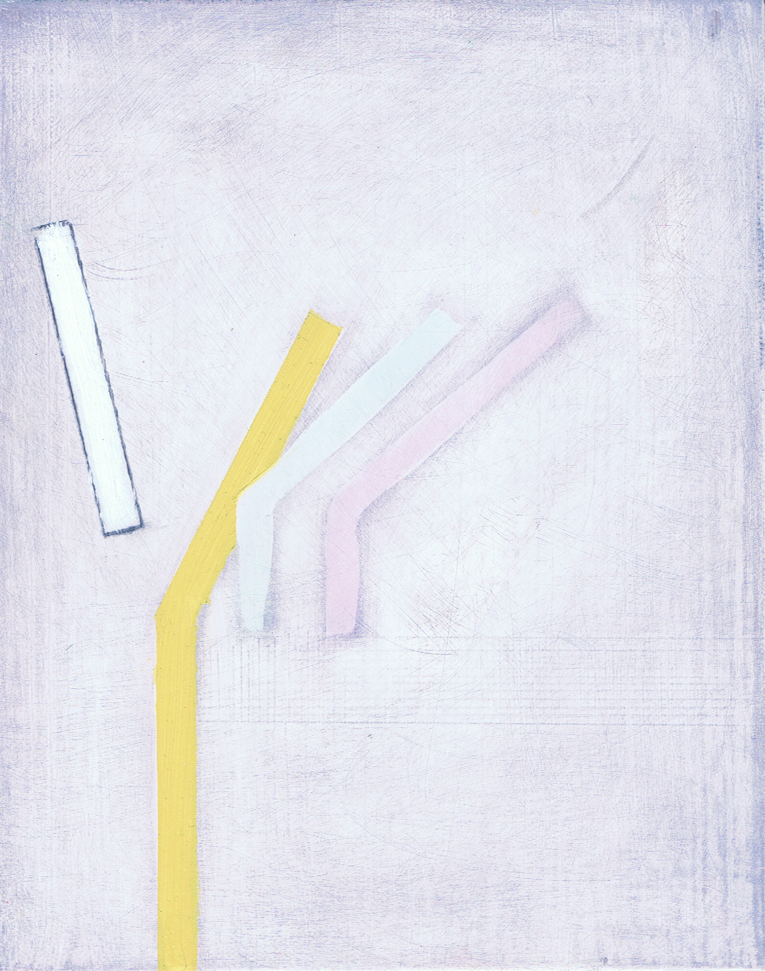 At Sea (in London) is a series of paintings that emerged from researching London’s skyscraper boom, with a close focus on the way construction cranes dominate the skyline. The paintings engage with a simple motif akin to cranes: vertical lines topped with diagonals move across stained and sanded grounds. In these images, the goal was to address the ephemeral and mobile, yet defining and monumental nature of cranes.
