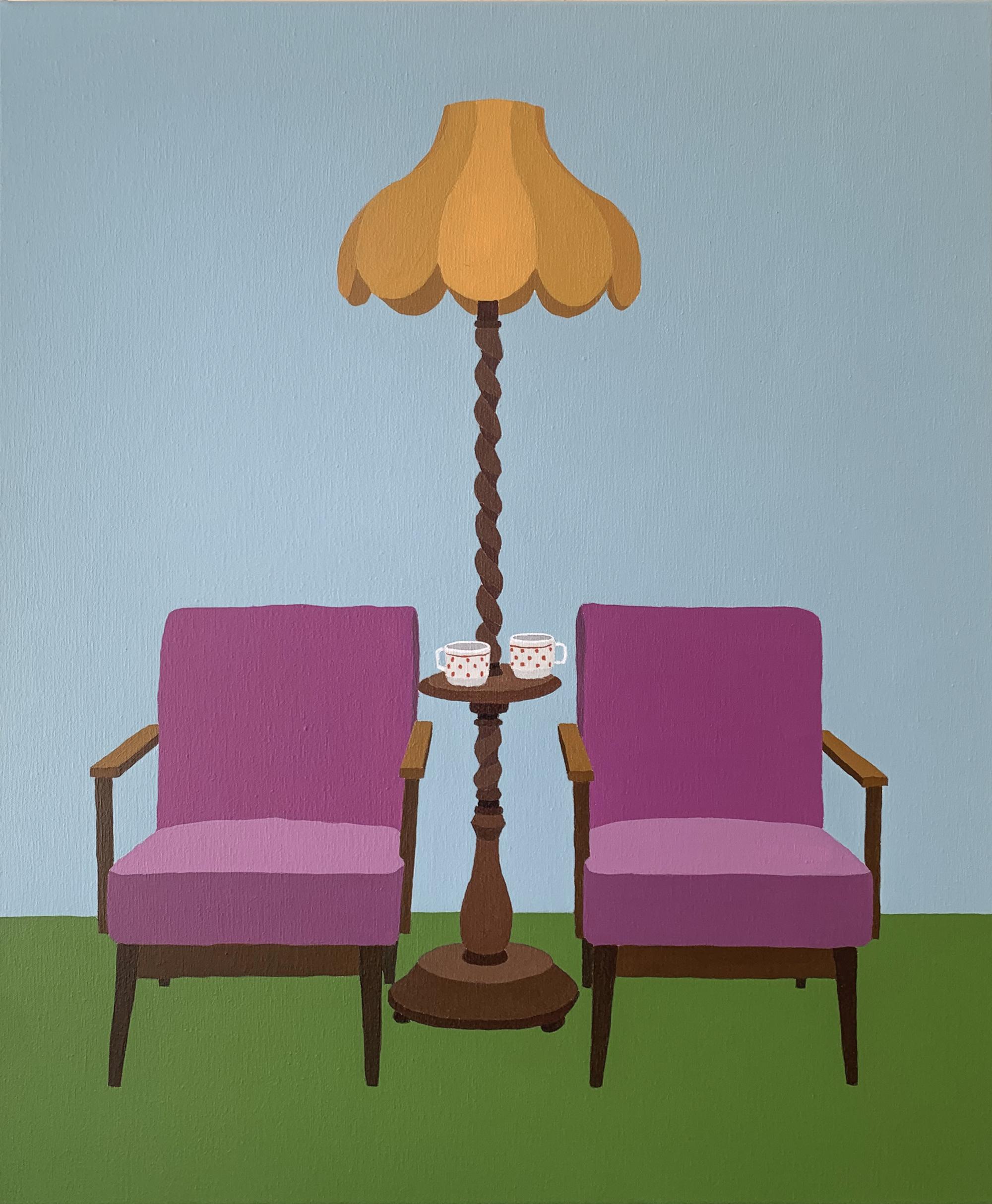 "Zsofia Schweger’s works presented here are some of the most detailed and narrative of her work to date. For Schweger, the temporary transition of her practice from a London-based studio to a hybrid-domestic space in Hungary marked a distinct shift in her painterly approach. Rather than leaving the marks on her canvases up to chance, Schweger exercises total control over her depicted environments. Working from these new fabricated scenes, for the first time in her practice Schweger is able to physically, in real time, inhabit and interact with the contexts she depicts. Formally, her paintings invite us in using the diagonals of one-point perspective and a very carefully constructed color scheme. There is inherent contradiction in our lived experience of this new body of work, absence and presence, stillness and movement, expansive space and stark flatness, deep feeling and clear apathy, a warm coziness and ominous dread, all elements of both the private and the social. In her large triptych, Schweger takes on a formal challenge of combining three canvases to create one long composition - one that can be rearranged in any combination, or the paintings can be hung separately, on their own. In her largest work of the show, Be Right Back (Feeding the Dogs, Perhaps), Schweger challenges our sense of scale - grossly exaggerating the size of domestic objects - a chair, cup of coffee, open book - to explore how this will feel for the viewer - a sense of domination, of comedy, or immersion."