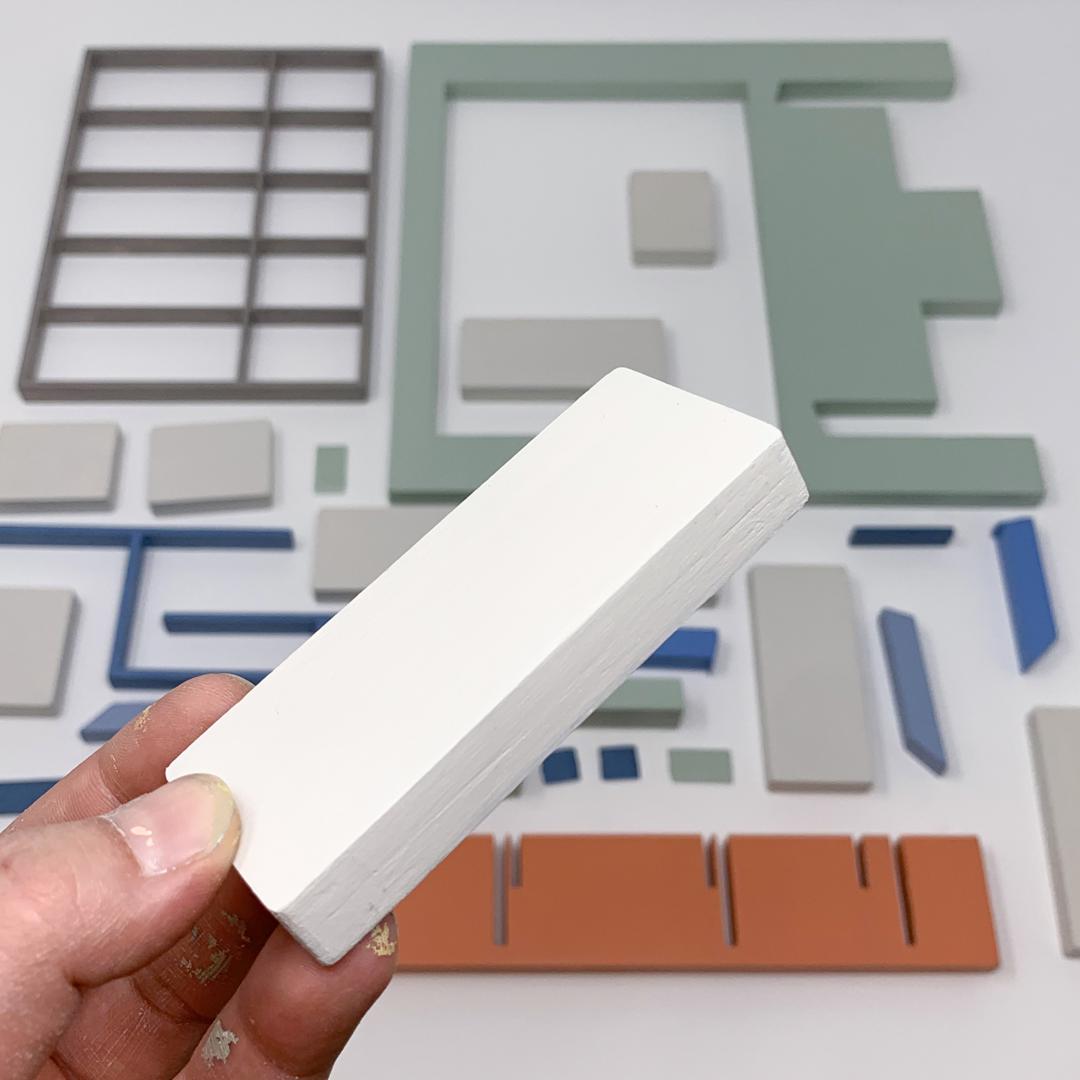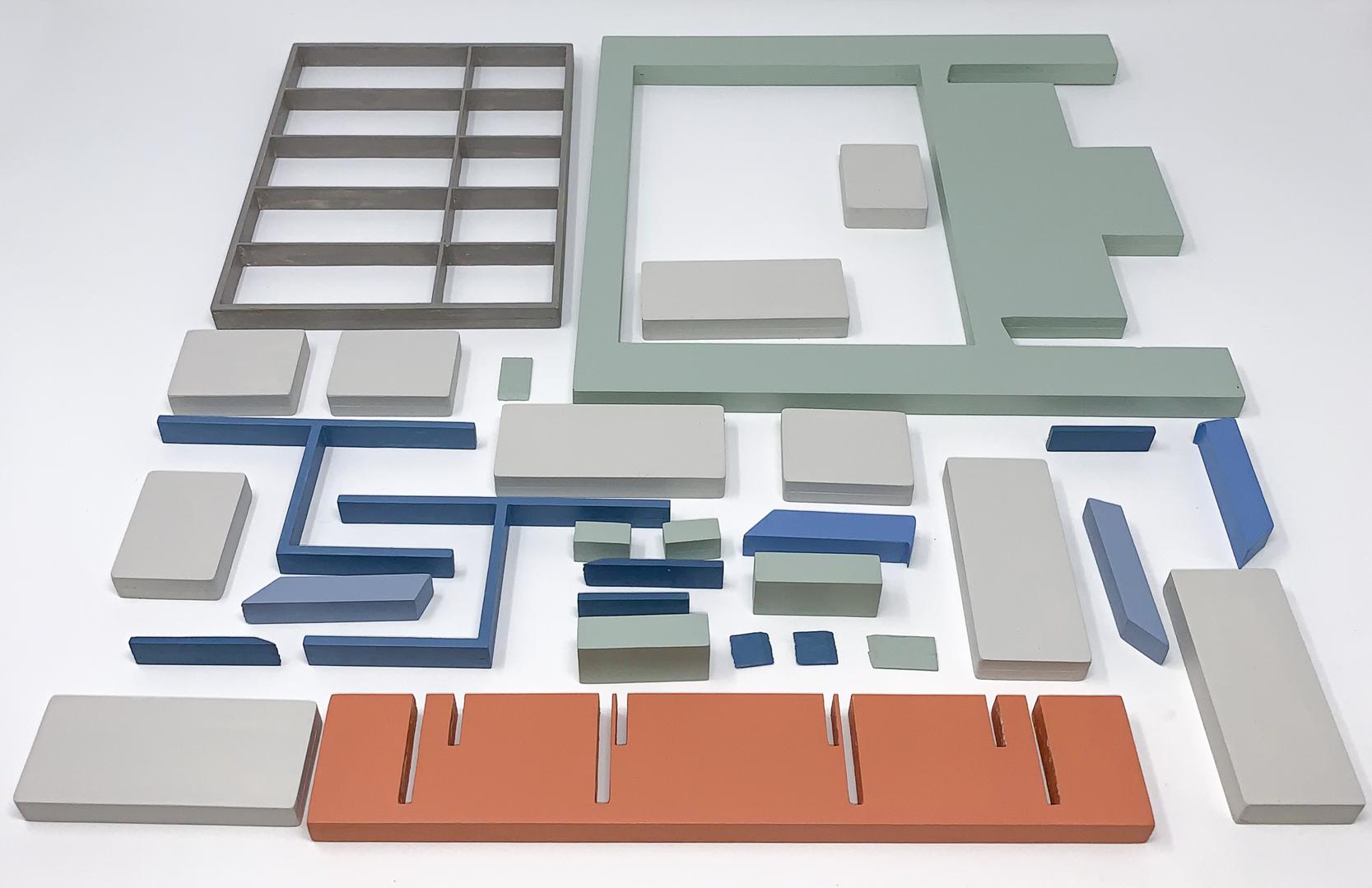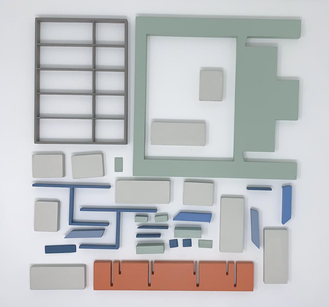 My assemblage-paintings are painted wooden blocks, which, when assembled, form representations of interiors. The blocks may be handled and rearranged. This potentially interactive viewer experience is informed by Froebel’s kindergarten gifts, an early childhood education tool, of which I learned through Frank Lloyd Wright’s work. I encountered Froebel blocks for the first time at the Wright Home & Studio, where they were on display. Wright claimed that his childhood exposure to Froebel blocks deeply influenced his approach to architecture, especially regarding geometric patterns and ornamentation. My assemblage-paintings attempt to de- and reconstruct my own compositions, potentially discovering new arrangements, patterns and meanings.