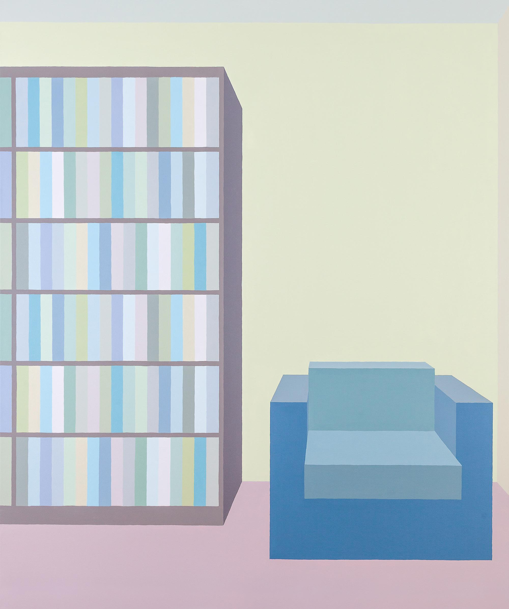 In my paintings of domestic and public interiors, I use reductive paint application and flat blocks of colour in order to express a sense of both alienation and comfort. At first glance, my paintings of spaces that are devoid of people and particularities might seem impersonal and uninviting. Yet, I aim to suggest a sense of intimacy through a quiet, muted, and potentially seductive colour palette. Similarly, I emphasise a shallow depth of spatial field, which might correspond to the way we localise our experiences of spaces. My methodical and controlled approach to formal elements and technique lets up, however, through touch: my hand trembles where colour blocks meet, forming gently wavering lines throughout the paintings, thus establishing a human presence. I want always to make paintings that are affecting and alive.