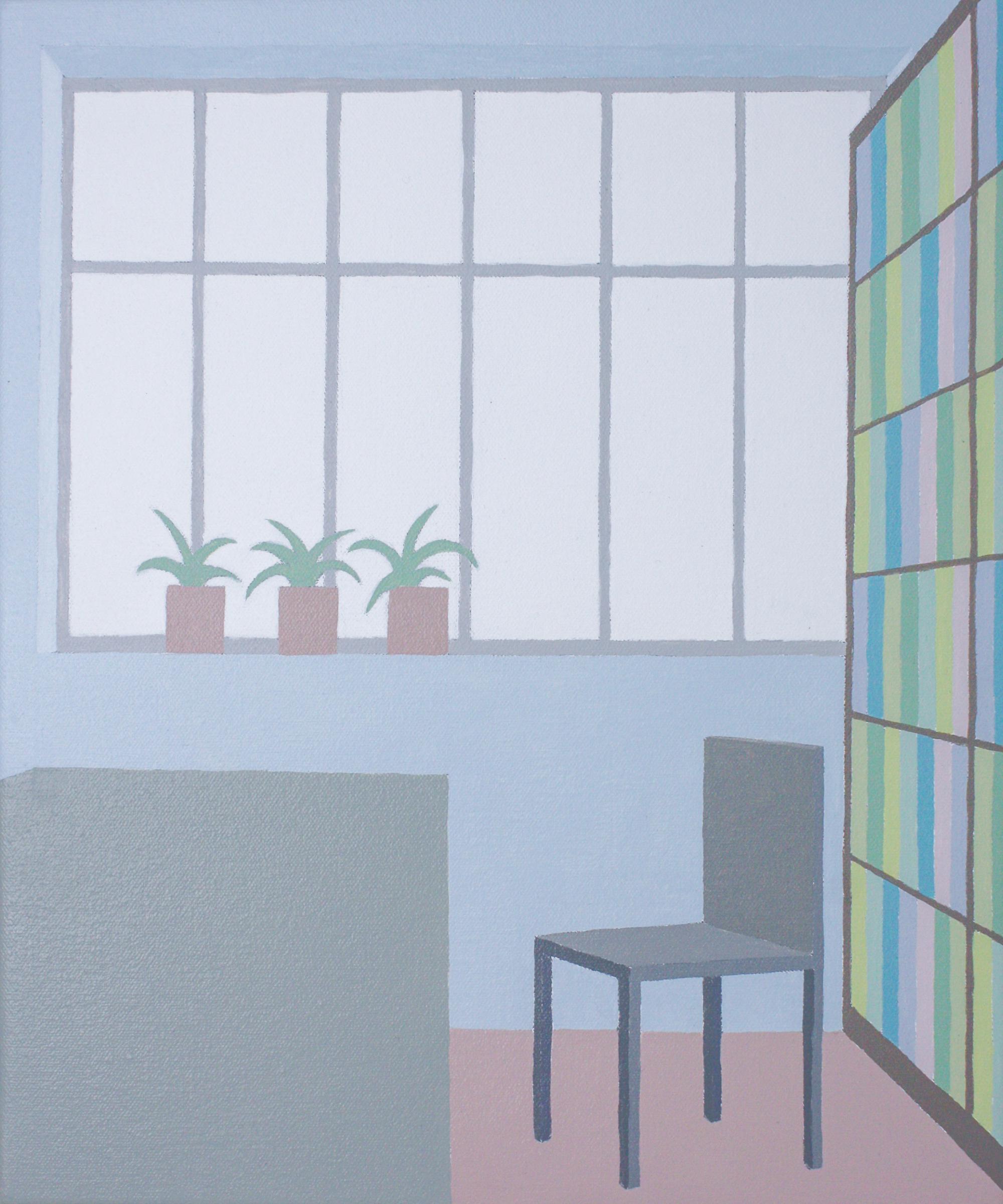 In my paintings of domestic and public interiors, I use reductive paint application and flat blocks of colour in order to express a sense of both alienation and comfort. At first glance, my paintings of spaces that are devoid of people and particularities might seem impersonal and uninviting. Yet, I aim to suggest a sense of intimacy through a quiet, muted, and potentially seductive colour palette. Similarly, I emphasise a shallow depth of spatial field, which might correspond to the way we localise our experiences of spaces. My methodical and controlled approach to formal elements and technique lets up, however, through touch: my hand trembles where colour blocks meet, forming gently wavering lines throughout the paintings, thus establishing a human presence. I want always to make paintings that are affecting and alive.