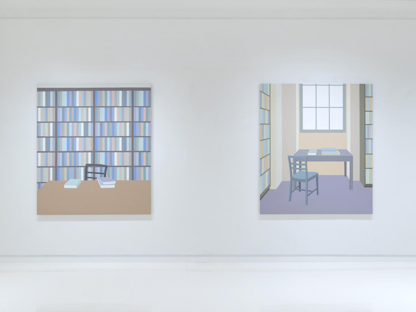 My most recent paintings take libraries as their subject. I am most interested in libraries as spaces that support learning and the general cultivation of thought in a social and political climate where fact-based expertise might be less valued. I feel that painting is an appropriate medium to depict library interiors, which are not only typically quiet and still, but have an air of permanence. Library interiors also provide me with an opportunity to further explore my formal painterly interests in space, stillness, order and colour.