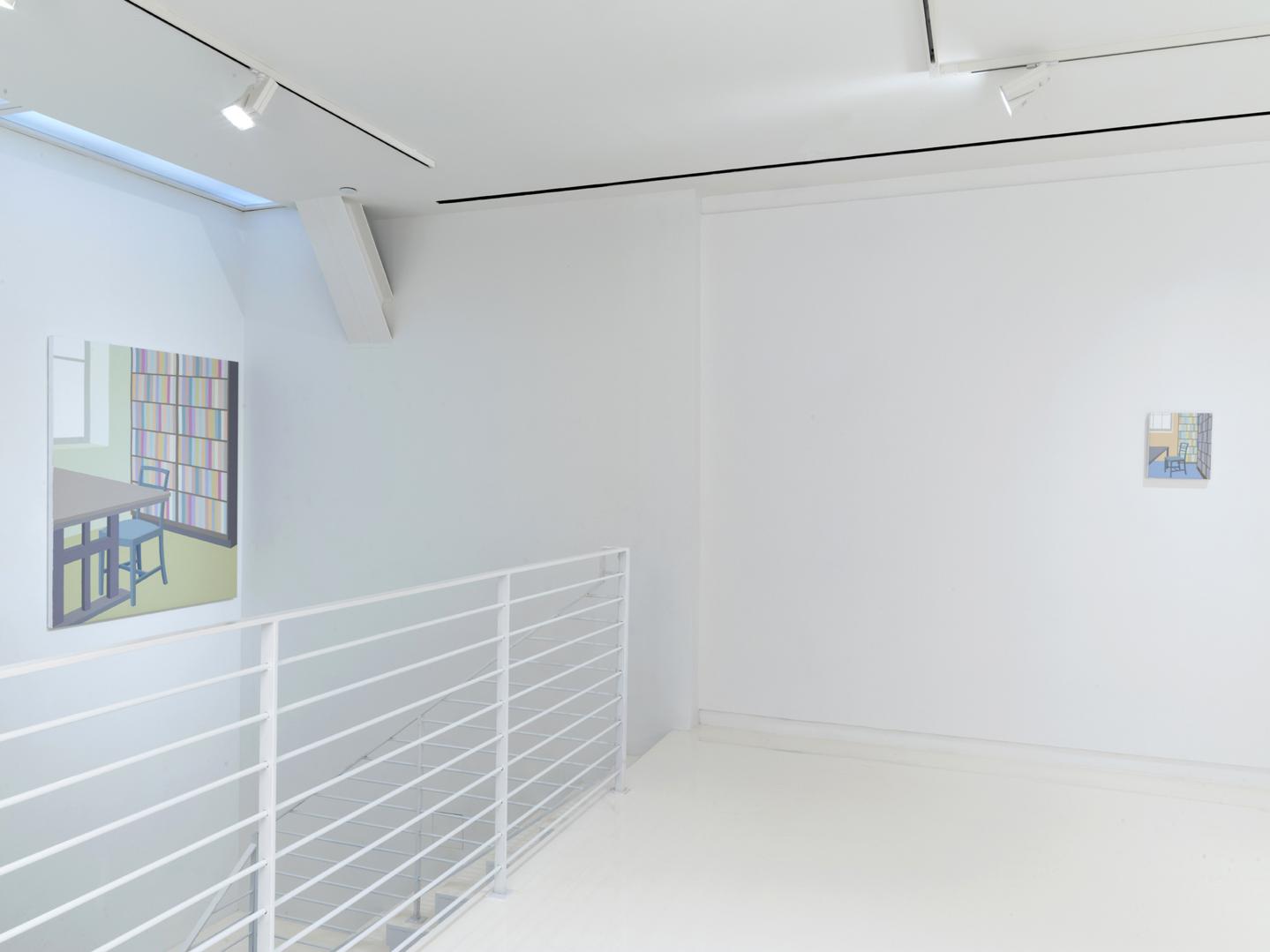 In my paintings of domestic and public interiors, I use reductive paint application and flat blocks of colour in order to express a sense of both alienation and comfort. At first glance, my paintings of spaces that are devoid of people and particularities might seem impersonal and uninviting. Yet, I aim to suggest a sense of intimacy through a quiet, muted, and potentially seductive colour palette. Similarly, I emphasise a shallow depth of spatial field, which might correspond to the way we localise our experiences of spaces. My methodical and controlled approach to formal elements and technique lets up, however, through touch: my hand trembles where colour blocks meet, forming gently wavering lines throughout the paintings, thus establishing a human presence. I want always to make paintings that are affecting and alive.