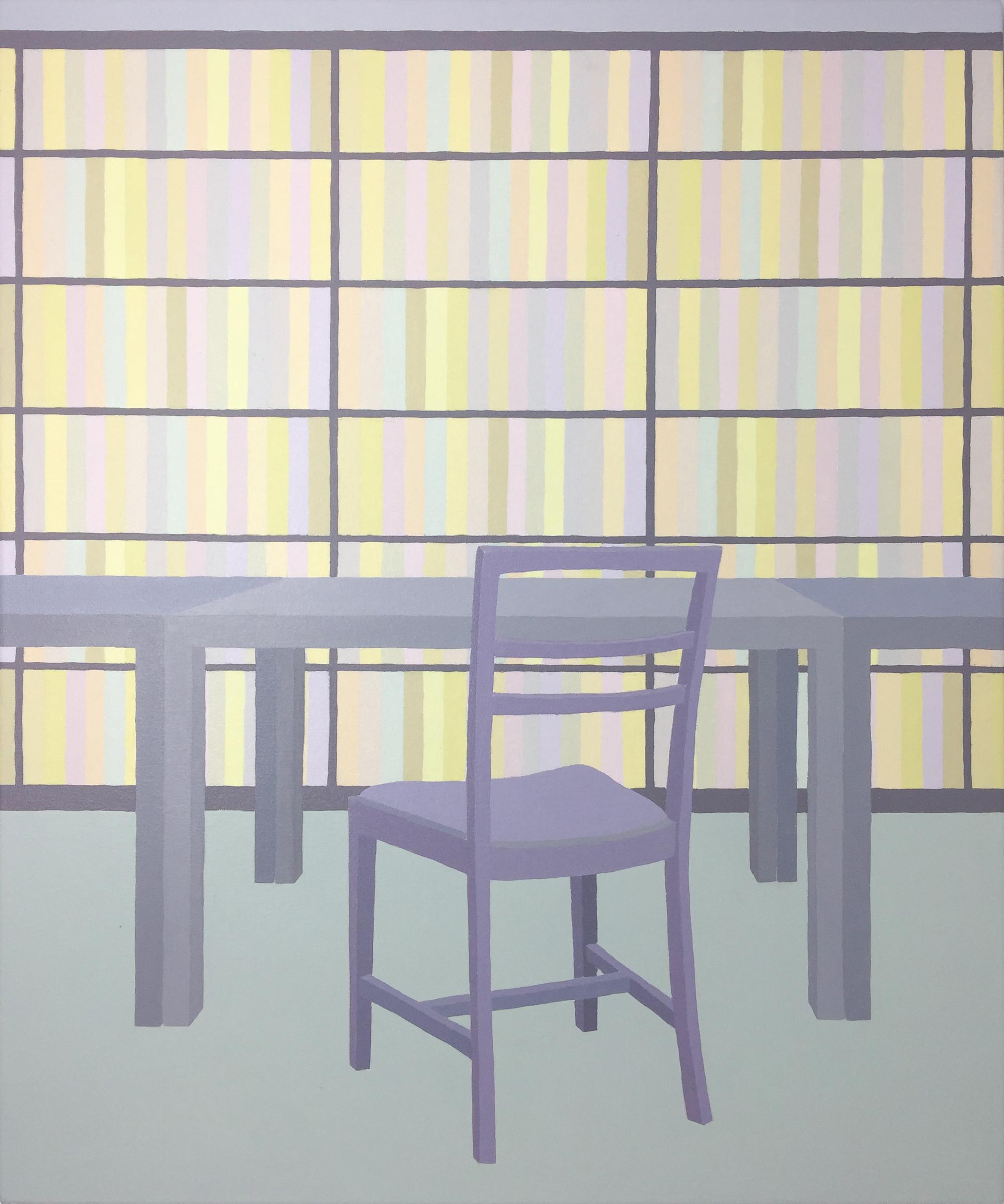 My most recent paintings take libraries as their subject. I am most interested in libraries as spaces that support learning and the general cultivation of thought in a social and political climate where fact-based expertise might be less valued. I feel that painting is an appropriate medium to depict library interiors, which are not only typically quiet and still, but have an air of permanence. Library interiors also provide me with an opportunity to further explore my formal painterly interests in space, stillness, order and colour.