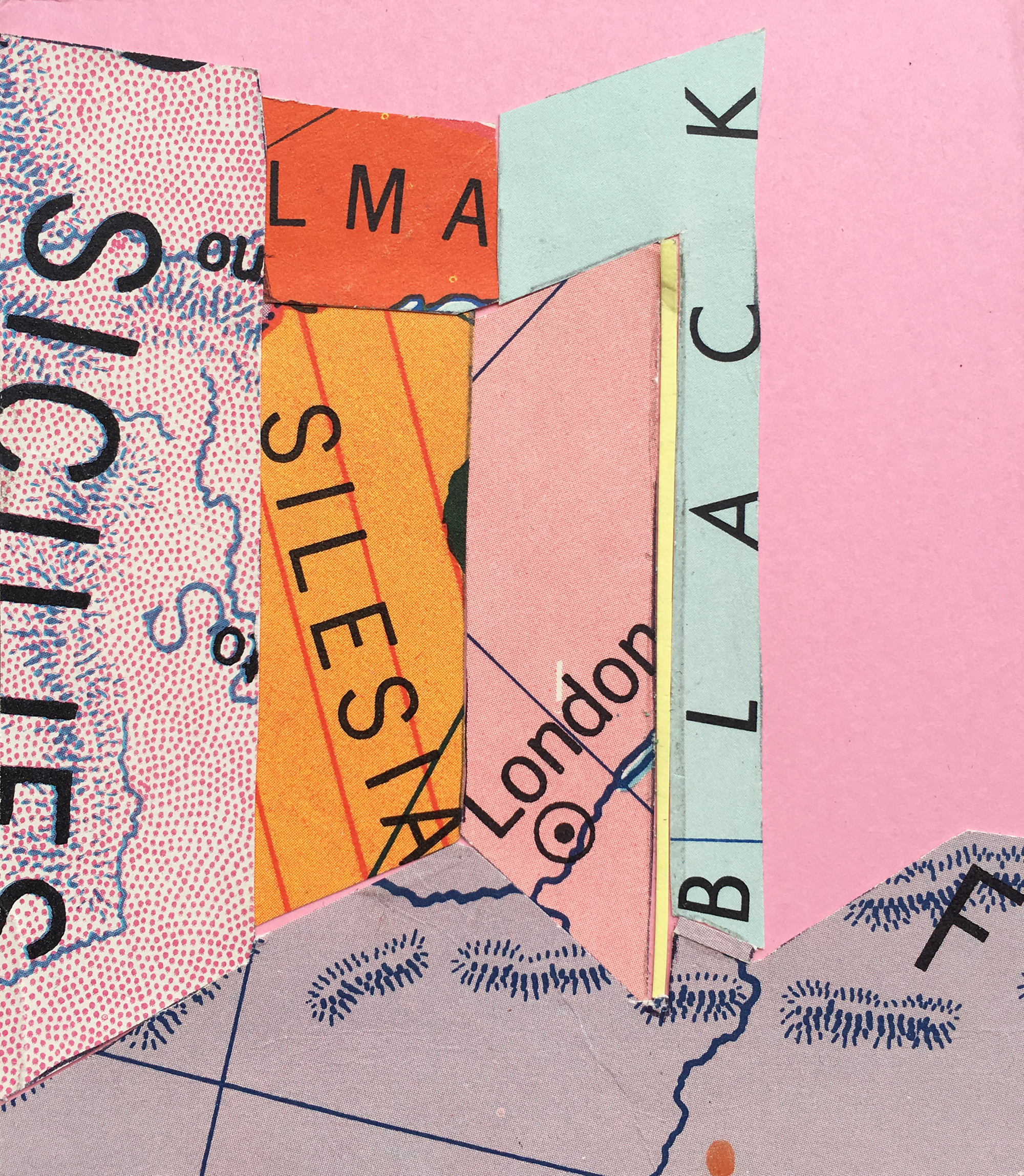 In this work, I studied a room in my first London flat through the assembly of twenty-eight 4” x 5” paper collages. Believing that being at home was newsworthy, I set out to create postcards made of old historical world maps that I had found among still-life props at Wellesley College - the maps were once used to teach history to the students of Wellesley. I cut up the found material into shapes of colour, and based on an observational sketch of the room, I compiled the works. Despite the collages’ modest size, with fractions of the maps clearly preserved and readable, I aimed to indicate scale, distance, and depth: an image of a room could contain the whole world.
