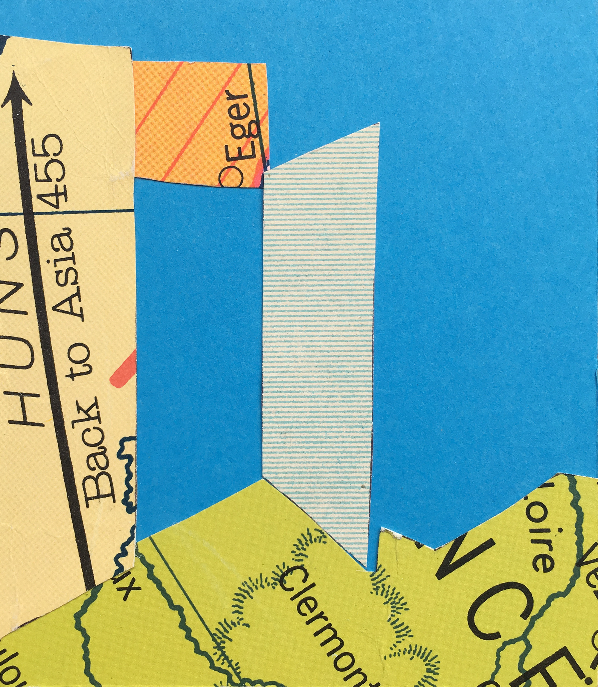 In this work, I studied a room in my first London flat through the assembly of twenty-eight 4” x 5” paper collages. Believing that being at home was newsworthy, I set out to create postcards made of old historical world maps that I had found among still-life props at Wellesley College - the maps were once used to teach history to the students of Wellesley. I cut up the found material into shapes of colour, and based on an observational sketch of the room, I compiled the works. Despite the collages’ modest size, with fractions of the maps clearly preserved and readable, I aimed to indicate scale, distance, and depth: an image of a room could contain the whole world.