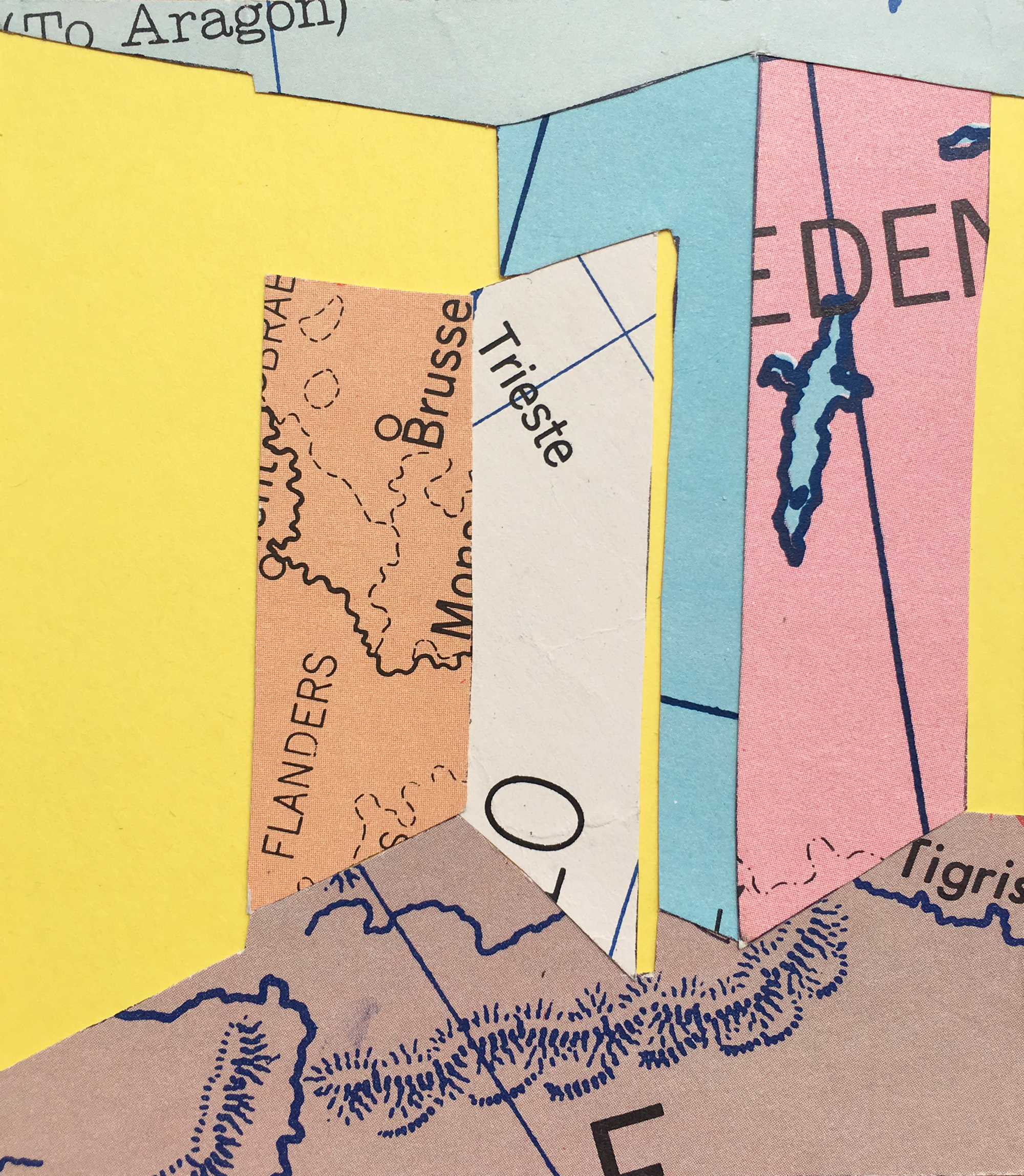 In this work, I studied a room in my first London flat through the assembly of twenty-eight 4” x 5” paper collages. Believing that being at home was newsworthy, I set out to create postcards made of old historical world maps that I had found among still-life props at Wellesley College - the maps were once used to teach history to the students of Wellesley. I cut up the found material into shapes of colour, and based on an observational sketch of the room, I compiled the works. Despite the collages’ modest size, with fractions of the maps clearly preserved and readable, I aimed to indicate scale, distance, and depth: an image of a room could contain the whole world.