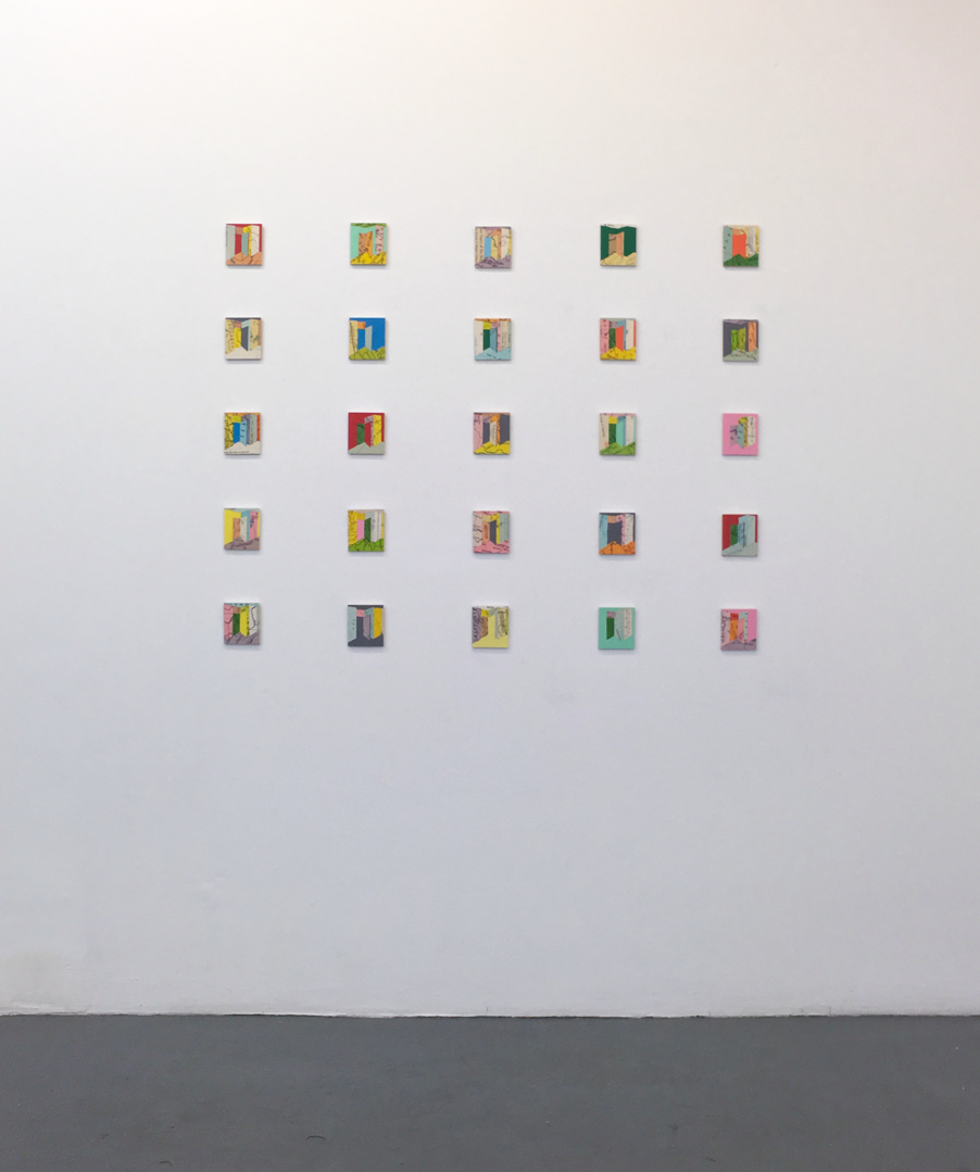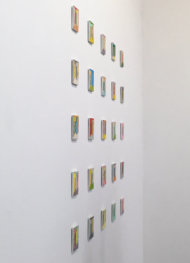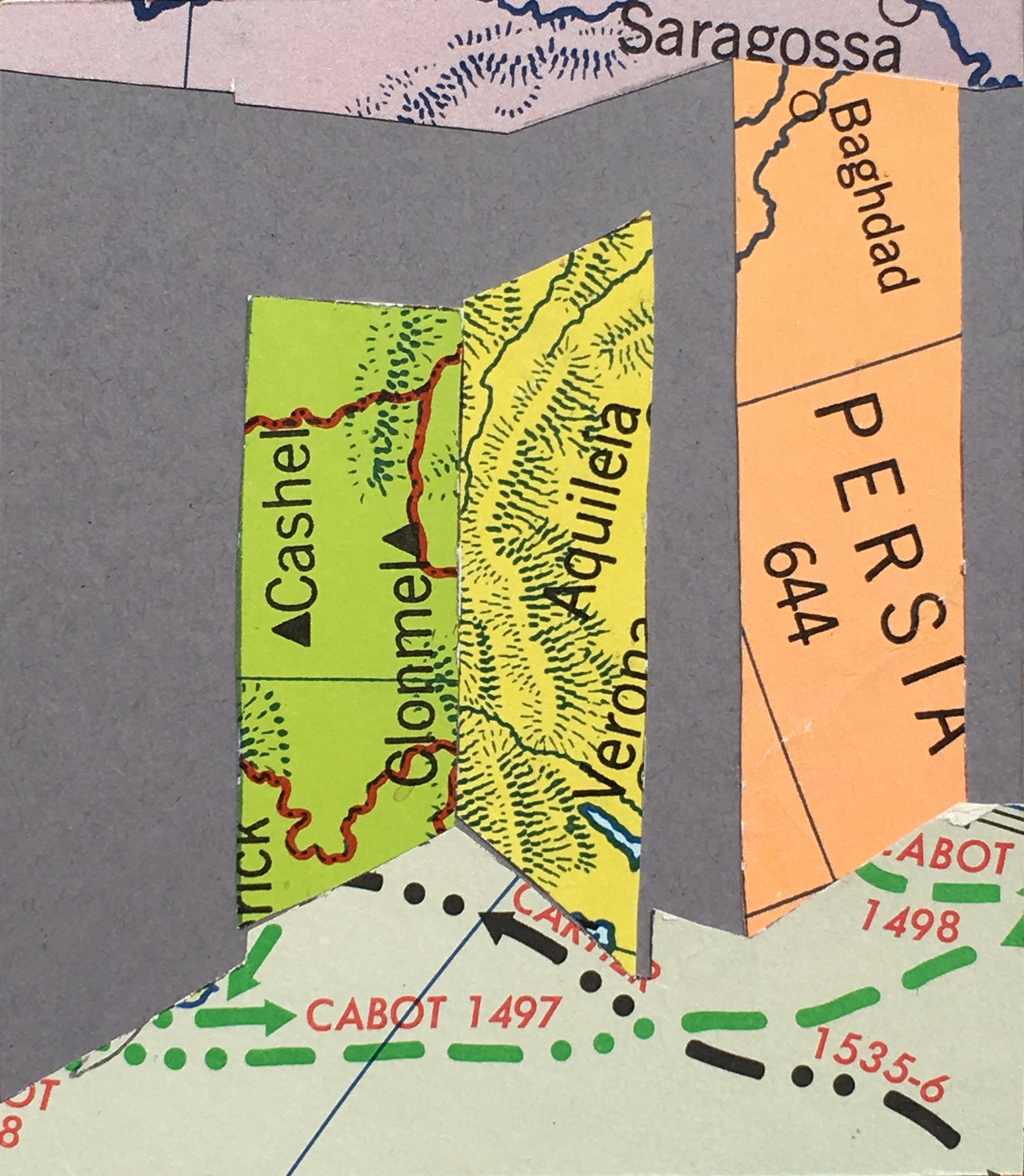 In this work, I studied a room in my first London flat through the assembly of twenty-eight 4” x 5” paper collages. Believing that being at home was newsworthy, I set out to create postcards made of old historical world maps that I had found among still-life props at Wellesley College - the maps were once used to teach history to the students of Wellesley. I cut up the found material into shapes of colour, and based on an observational sketch of the room, I compiled the works. Despite the collages’ modest size, with fractions of the maps clearly preserved and readable, I aimed to indicate scale, distance, and depth: an image of a room could contain the whole world.
