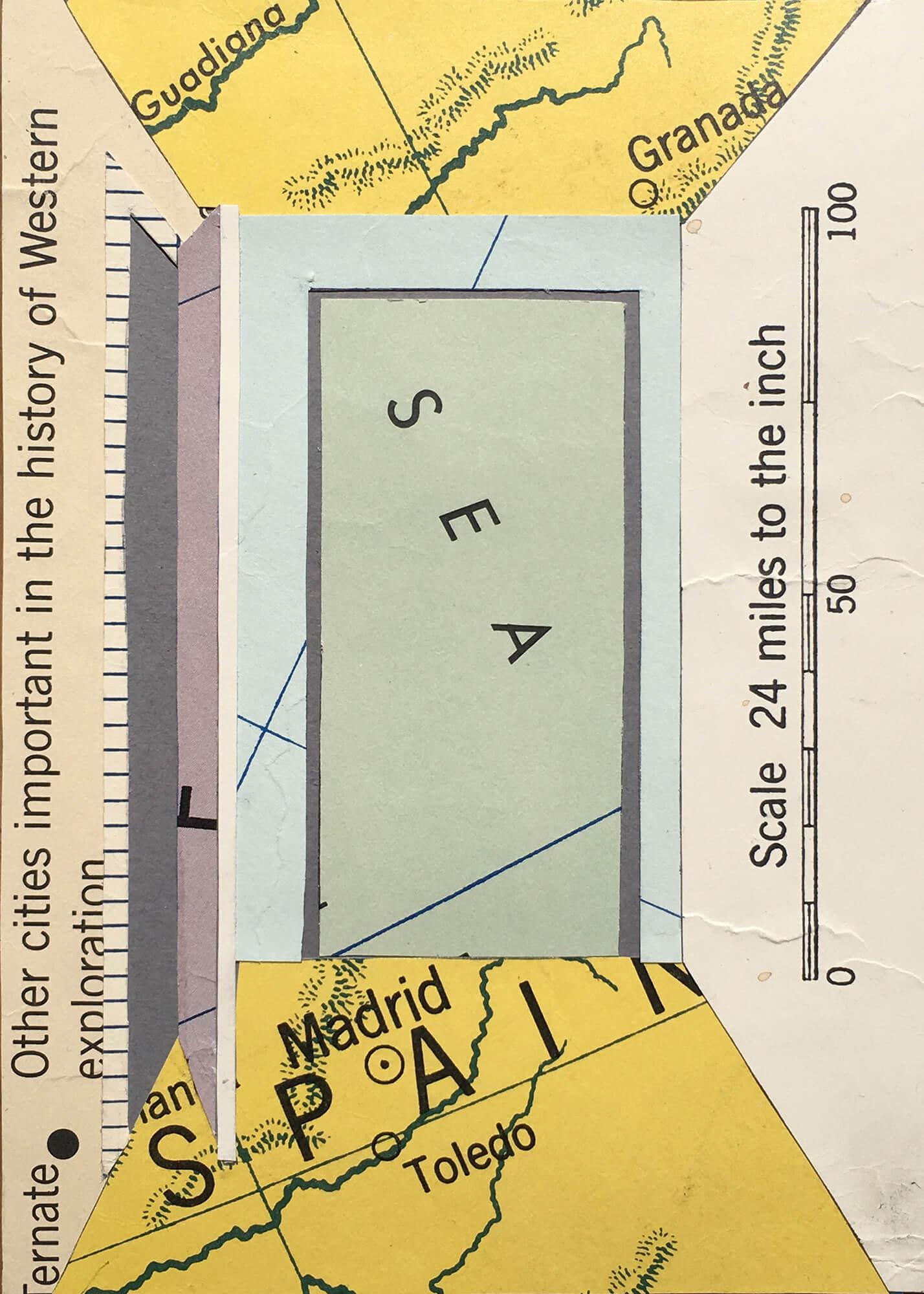 In this work, I studied a room in my first London flat through the assembly of twenty-eight 4” x 5” paper collages. Believing that being at home was newsworthy, I set out to create postcards made of old historical world maps that I had found among still-life props at Wellesley College - the maps were once used to teach history to the students of Wellesley. I cut up the found material into shapes of colour, and based on an observational sketch of the room, I compiled the works. Despite the collages’ modest size, with fractions of the maps clearly preserved and readable, I aimed to indicate scale, distance, and depth: an image of a room could contain the whole world.