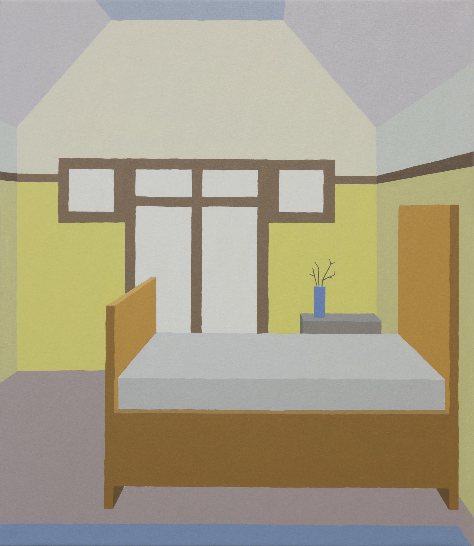 My paintings take Frank Lloyd Wright’s domestic architecture as their subject: they depict interiors of the Frank Lloyd Wright Home & Studio and Robie House, both in Chicago. It was during a recent visit to Chicago that I learned in depth about Frank Lloyd Wright’s domestic architecture. Wright’s signature Prairie style immediately resonated with me: his straight line aesthetic, as well as his belief in the decorative value of the flat surface are elements that I have explored in my own paintings. My visual style has been influenced by my upbringing in the Great Plain of Hungary, while Wright has claimed that the broad, flat landscape of the American Midwest inspired the dramatic horizontal lines of his Prairie buildings. These are the connections that drive my engagement with Wright’s interiors.