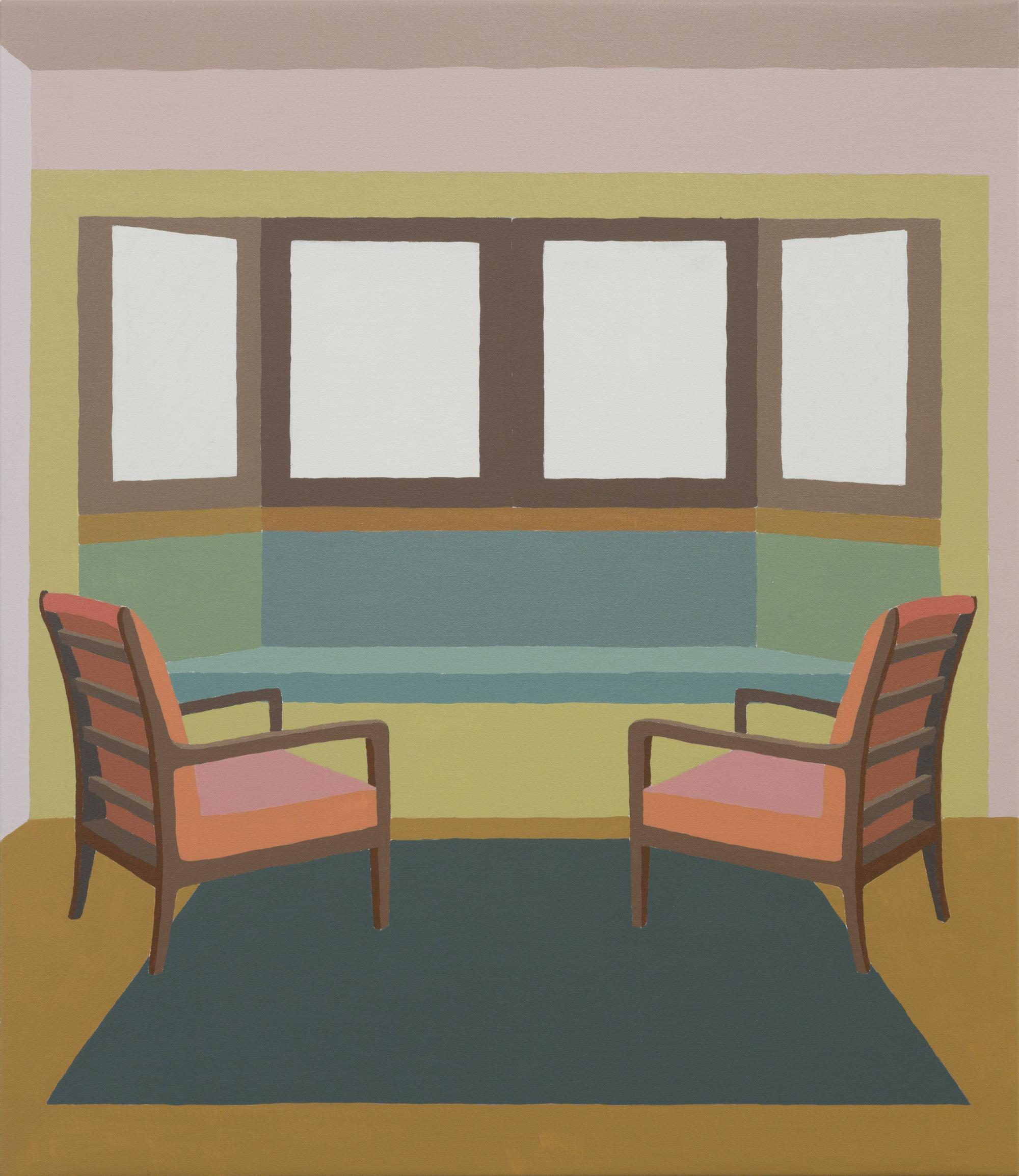 My paintings take Frank Lloyd Wright’s domestic architecture as their subject: they depict interiors of the Frank Lloyd Wright Home & Studio and Robie House, both in Chicago. It was during a recent visit to Chicago that I learned in depth about Frank Lloyd Wright’s domestic architecture. Wright’s signature Prairie style immediately resonated with me: his straight line aesthetic, as well as his belief in the decorative value of the flat surface are elements that I have explored in my own paintings. My visual style has been influenced by my upbringing in the Great Plain of Hungary, while Wright has claimed that the broad, flat landscape of the American Midwest inspired the dramatic horizontal lines of his Prairie buildings. These are the connections that drive my engagement with Wright’s interiors.
