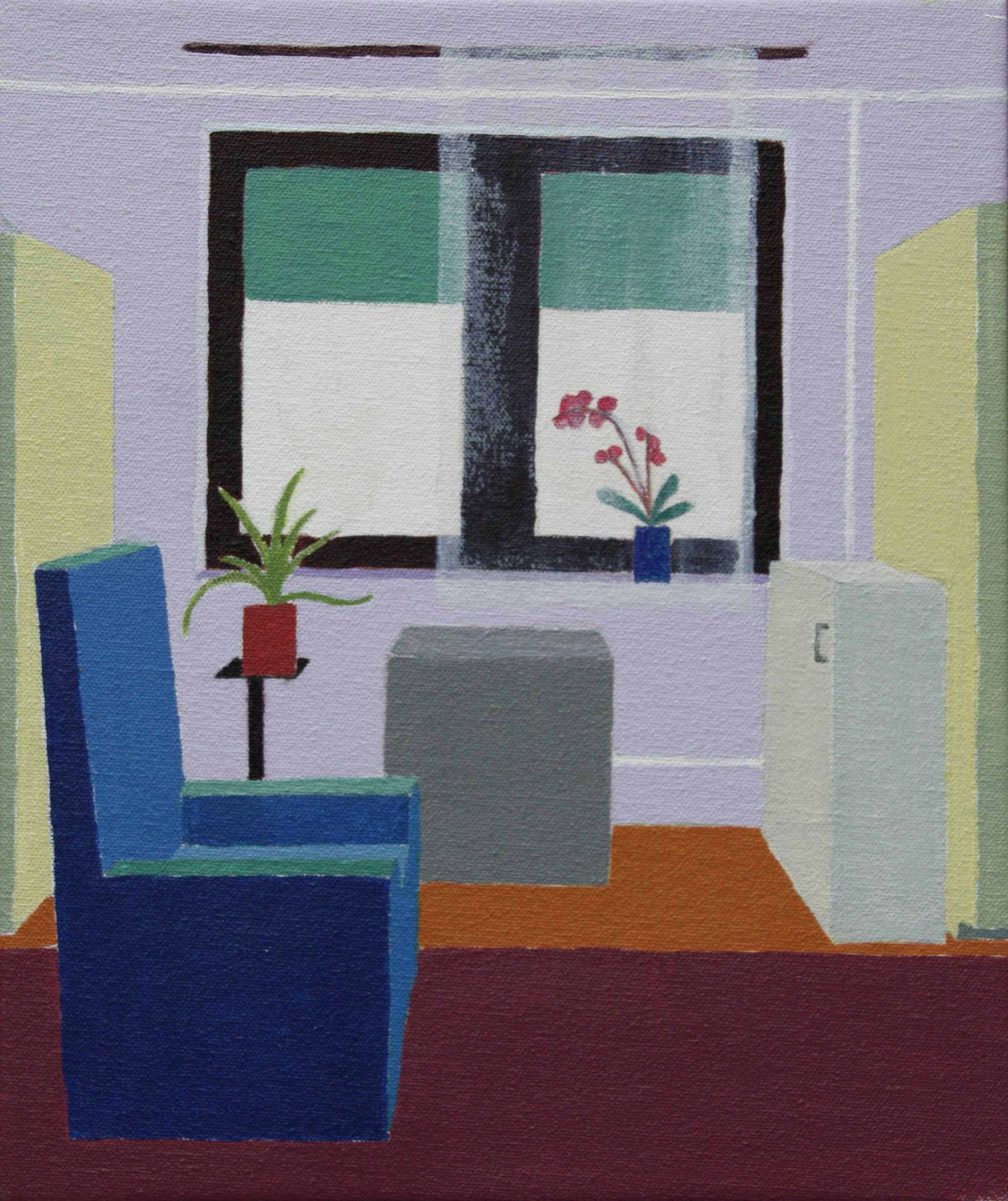 I pair potentially pleasant domestic interiors rendered in possibly seductive colours with a sure sense of alienation expressed by reductive and non-hierarchical paint application. My methodical, controlled approach to technique lets up, however, through touch: my hand trembles where colour blocks meet forming gently wavering lines.  I want always to make paintings that are affecting and alive.