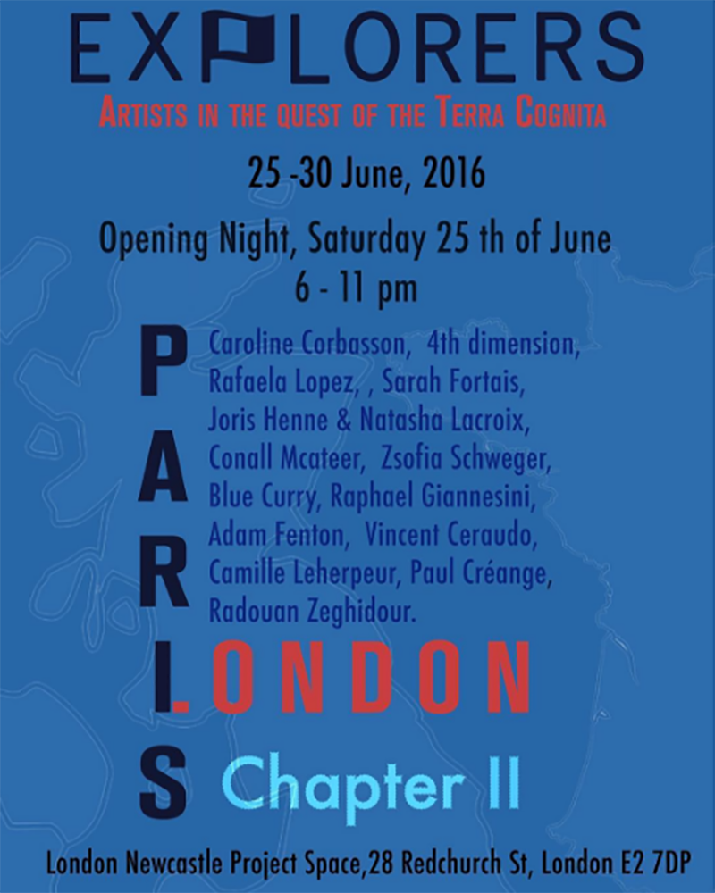 Explorers brings together in Paris and London more than 17 upcoming artists in two ambitious exhibitions in Paris and London. These exhibitions are thought like an initiatory journey at the heart of new forms of creativity, investigating the idea of exploration in the context of today’s Terra Cognita; where all territories are mapped out, accessible, connected and where each individual can be linked to a geolocalisation device.