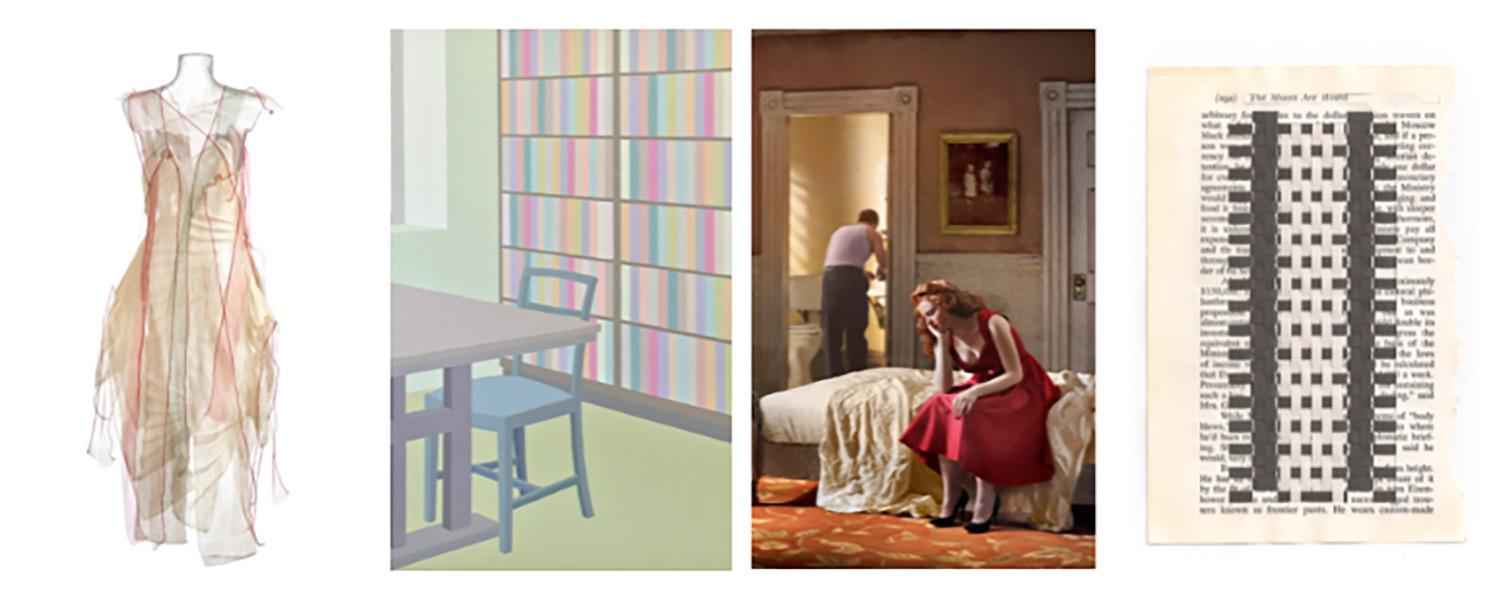 Hungarian artist Zsofia Schweger presents large meditative paintings of nondescript interiors that reflect notions of home, belonging and the emigrant experience. Her large-scale geometrically inspired interiors in bright colours form a central focus. Digitally contrived photographs of reinvented well-known paintings by American artist Richard Tuschman show quiet personal connections of figures in familiar settings and capture themes of solitude and longing. Bogota, Colombian artist Cristina Velásquez creates multiples of woven paper works recognizing the impact of quiet repetition. Danish artist Anne Damgaard’s first presentation in the U S. with a dynamic flair, Damgaard’s fashions show as objets d’art.