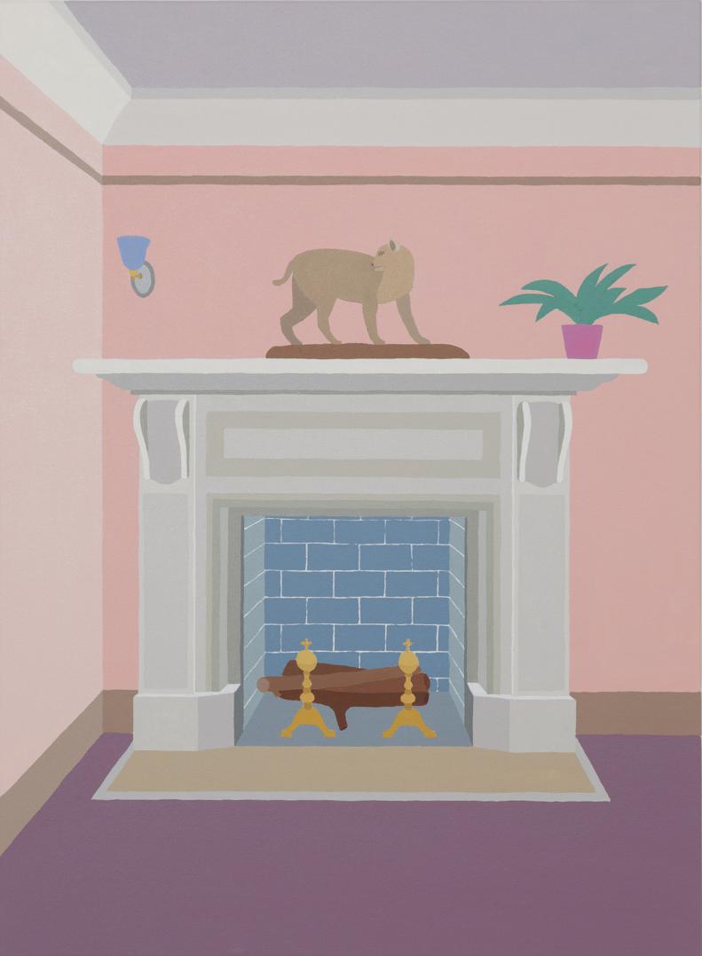 The paintings take real, observed Miami spaces as their subject, each of which is noted in their titles: the kitchen of the Fountainhead Residency house, a piano in a Miami home, a living room of a Miami guest house, a fireplace with a taxidermy bobcat from the Deering Estate (a house museum), as well as a scene from a taco place on the beach (Lolo’s Cantina) and another from Jimmy’s Eastside Diner (near Fountainhead).
