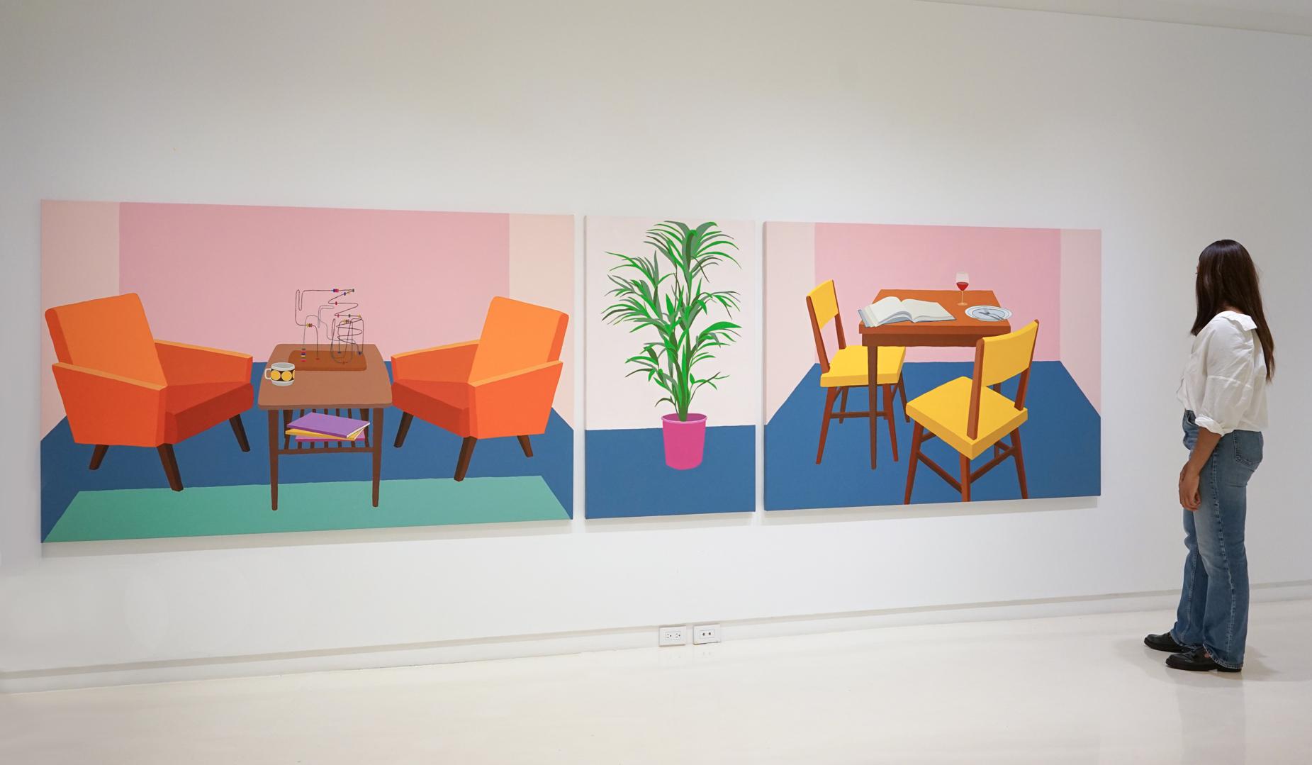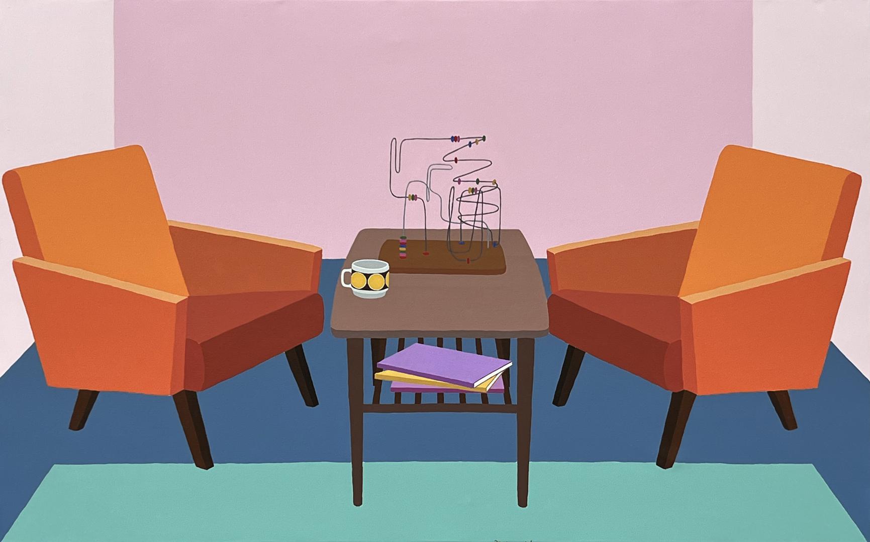 Zsofia Schweger’s works presented here are some of the most detailed and narrative of her work to date. For Schweger, the temporary transition of her practice from a London-based studio to a hybrid-domestic space in Hungary marked a distinct shift in her painterly approach. Rather than leaving the marks on her canvases up to chance, Schweger exercises total control over her depicted environments. Working from these new fabricated scenes, for the first time in her practice Schweger is able to physically, in real time, inhabit and interact with the contexts she depicts. Formally, her paintings invite us in using the diagonals of one-point perspective and a very carefully constructed color scheme. There is inherent contradiction in our lived experience of this new body of work, absence and presence, stillness and movement, expansive space and stark flatness, deep feeling and clear apathy, a warm coziness and ominous dread, all elements of both the private and the social. In her large triptych, Schweger takes on a formal challenge of combining three canvases to create one long composition - one that can be rearranged in any combination, or the paintings can be hung separately, on their own. In her largest work of the show, Be Right Back (Feeding the Dogs, Perhaps), Schweger challenges our sense of scale - grossly exaggerating the size of domestic objects - a chair, cup of coffee, open book - to explore how this will feel for the viewer - a sense of domination, of comedy, or immersion.