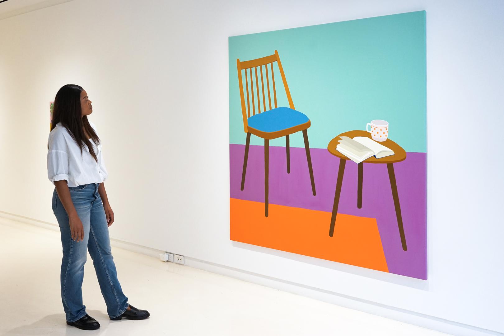 "Sapar Contemporary is pleased to present Nostalgia: an exhibition of new paintings by Zsofia Schweger (Hungary/UK) and Nick Dawes (UK), and the first project of Dawes’ with the gallery. Underlying both of these two very different practices is a marked sense of nostalgia. For Schweger, this new series of work depicts an escape from the turbulence of the moment, when she left her adult home in London in the middle of the pandemic to return to her childhood home in southeast Hungary. This shift has changed Schweger’s long-established practice of basing her compositions on actual physical spaces she visited or lived in to painting from carefully constructed environments made from collected and familiar objects and furniture.  The palpable ephemera of human presence in these paintings  - the empty coffee cups, solitary dinner scene, open books - evidence a tension between something complete and something missing.  Either someone is about to enter or has just left.  Dawes’ paintings, on the other hand, begin with quotidian objects connected to signage - such as street signs that the artist encounters on his walks. The paintings are then abstracted from those objects. Dawes pushes the boundaries of painting by using industrial household paint instead of oil paint, and resisting the grid, and most importantly forgoes the brush, as his paintings are made exclusively by pouring. What is left through these actions of transformation are non-binary layered shapes and colors that approach painting from the other - more nostalgic - side. Together, these diverse works create in the viewer a simultaneously unsolicited, and yet welcome, longing for more.